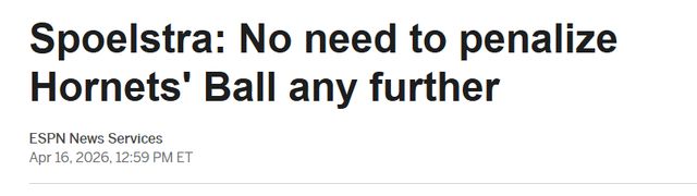 热火刚刚以126比127客场不敌黄蜂、无缘季后赛,赛后球队于今日召开赛季总结会议。斯波斯特拉在会上表示:“我认为没必要再对他进行后续追加处罚,那样并不合理。”在那场焦点对决中,阿德巴约因摔倒时被鲍尔拉扯脚踝受伤,提前长时间离场。
