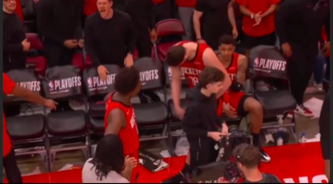 替补席的申京怒摔毛巾,火箭球员面无表情。