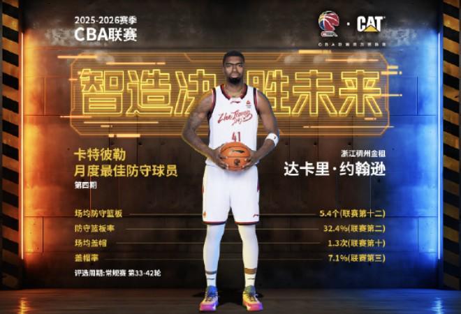 CBA官方写道:恭喜浙江稠州篮球俱乐部球员达卡里-约翰逊当选 2025-2026赛季CBA联赛第四期月度最佳防守球员(第33-42 轮)!