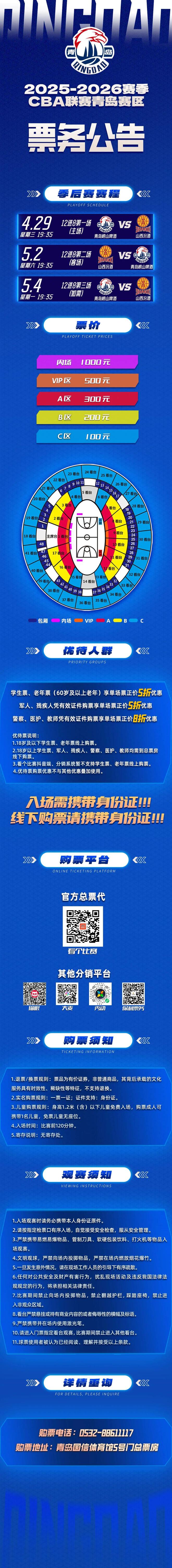 今天11:18,季后赛首个主场球票正式开售!相约主场,和我们共赴季后赛巅峰对决,捍卫青岛主场荣耀!