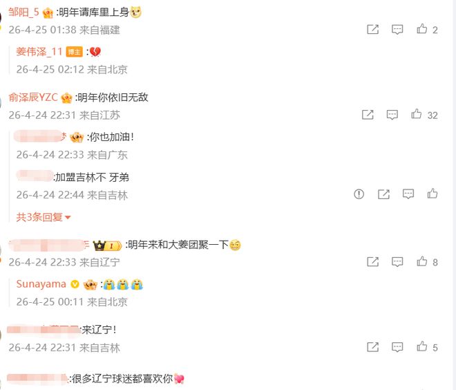 在姜伟泽社媒评论区,还出现了2位CBA球员的留言,福建男篮的邹阳调侃姜伟泽:明年请库里上身;辽宁的俞泽辰则回复:明年你依旧无敌。评论区下方,则有不少球迷喊话姜伟泽下赛季加盟辽宁。