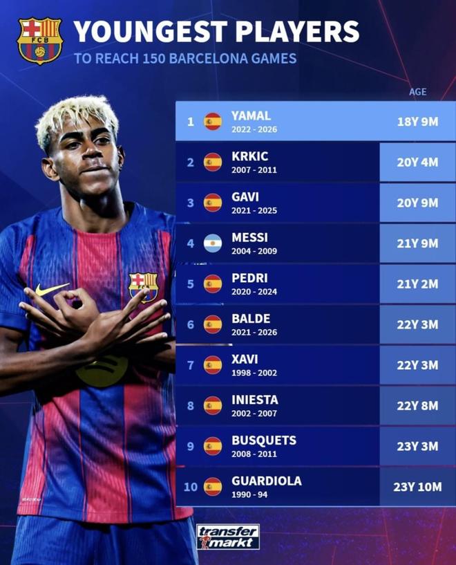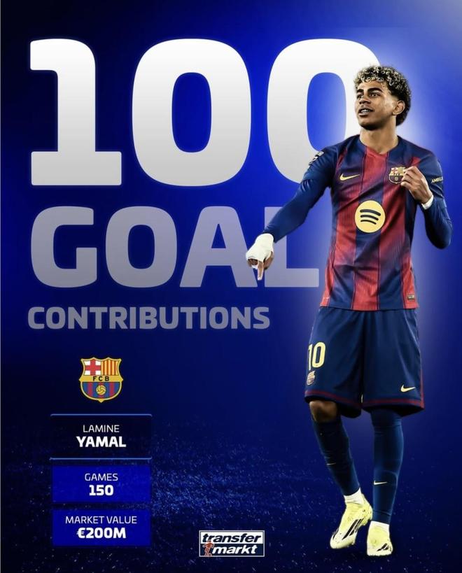 最近德国转会市场发布了巴萨队史最年轻达成150场的球员榜单。亚马尔不仅排在第一,而且把这项纪录的年龄提前了一大截。在榜单上,克尔基奇是20岁4个月,加维是20岁9个月,梅西是21岁9个月,佩德里是21岁2个月,而亚马尔只有18岁9个月。另一张海报给出的信息更直接:150场比赛,直接参与100个进球,身价达到2亿欧元。对于一名还没满19岁的球员来说,他早就不是刚冒头的天才,而是巴萨目前整套进攻体系中最核心的球员。
