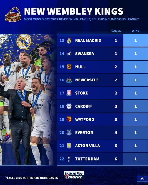 接下来这个跨度有点大,从皇马直接跳到斯旺西和赫尔城,但这三类情况确实能放一块说:这三家都是在温布利赢过一次。皇马是2024年欧冠决赛赢的。
